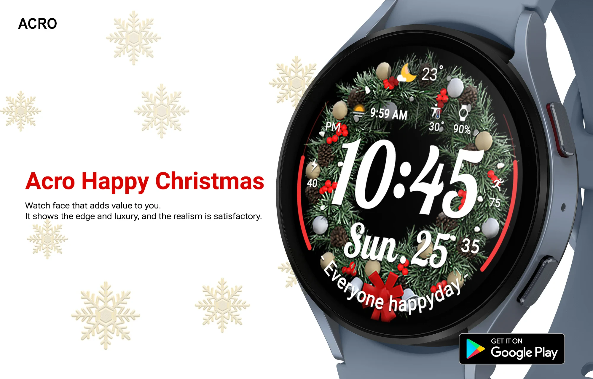 The ACRO Happy Christmas Watchface is a festive smartwatch face designed to transform your wearable device into a cheerful holiday companion, offering customizable seasonal displays for users with Apple Watch, Galaxy Watch, or Wear OS devices. This watchface brings the magic of Christmas to your wrist, combining elegant design with functional elements like animated snowflakes, traditional holiday motifs, and interchangeable themes that adapt to your preferred color scheme.