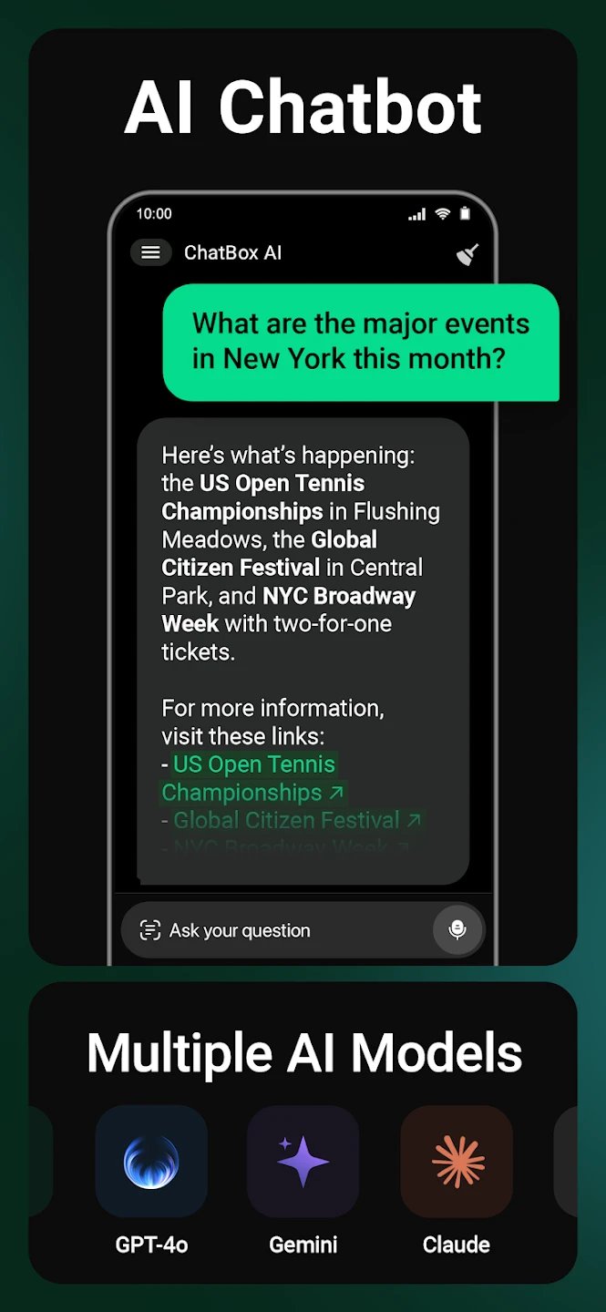 - Privacy Controls: ChatBox encrypts conversations and lets you delete history with a single tap, ensuring your information remains secure. This makes sensitive discussions, like medical queries, safer and more trustworthy.