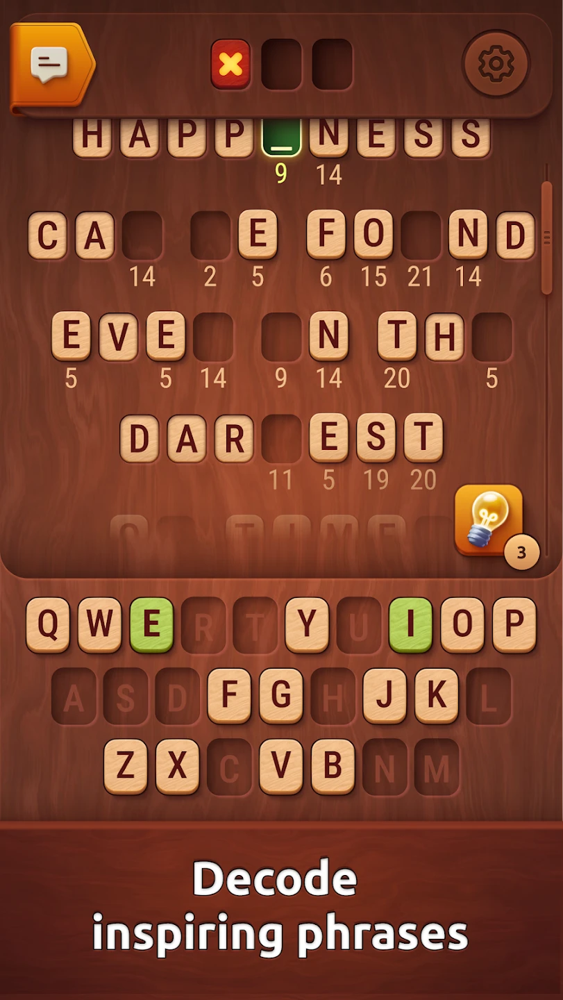- Core Gameplay Loop: The main objective is to decode secret words by replacing coded letters with their correct counterparts, gradually revealing hidden messages while building your vocabulary. Players interact with the game world by tapping on letter tiles to rearrange them, using hints when needed, and submitting solutions.