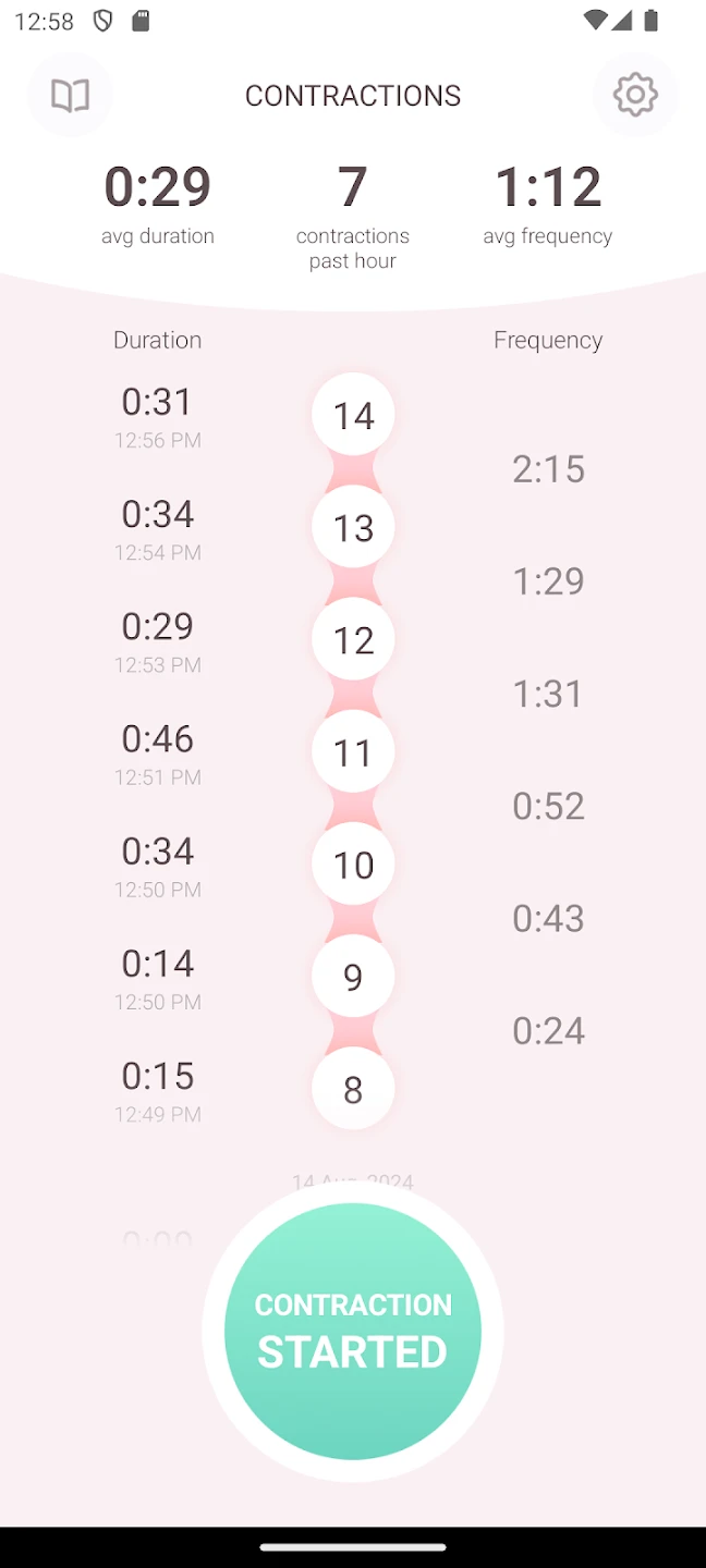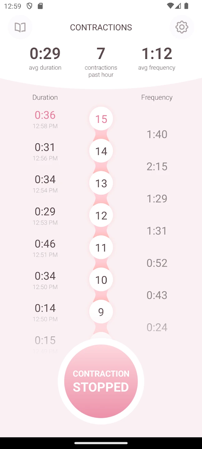 - Start/Stop Button & Duration Counter: Begin timing a contraction, and the app automatically stops when you press the button again (indicating its end). This simple feature accurately records contraction length and total duration, helping you understand how your body is responding over time. Knowing the average contraction length is key information for assessing labor progress.