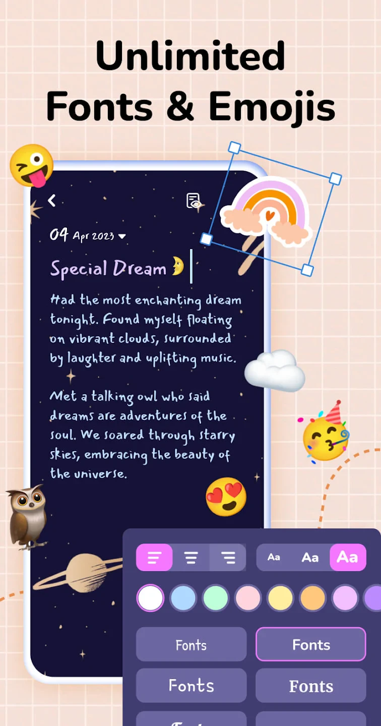 - Rich Text Entry with Formatting: Create beautifully formatted journal entries complete with bold text, bullet points, and color customization. This enhances the expressive experience, allowing for visually distinct entries that mirror handwritten styles while preserving content privacy.
