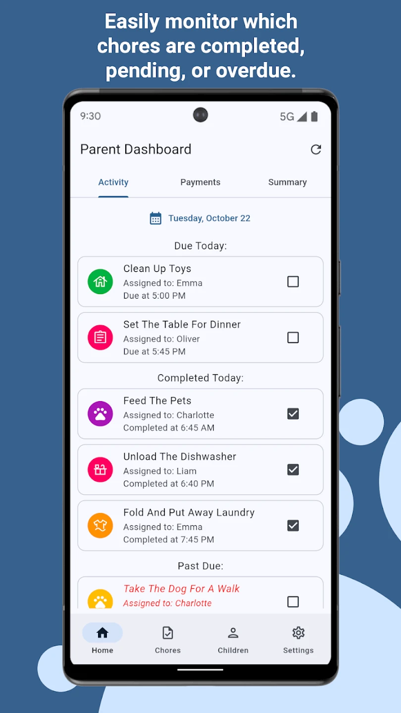 - Progress Monitoring and Reporting: View real-time updates on task completion through intuitive dashboards and visual indicators. The system tracks individual progress, weekly/monthly summaries, and outstanding tasks, allowing for quick oversight. With customizable notification settings, parents can stay informed about chore completion, and children can see their accomplishments visually represented.