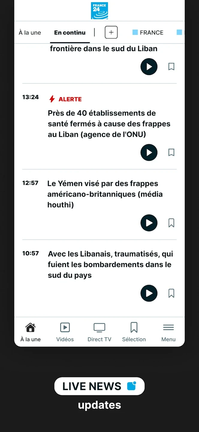 - Live Video Streaming: Access high-quality video feeds of the main FRANCE 24 television channel directly from the app, featuring breaking news, reports, and documentaries. This feature is essential for users wanting to experience global news as it happens, allowing them to watch correspondents report from conflict zones or major events instantly, providing an immersive news experience on their smartphone or tablet.