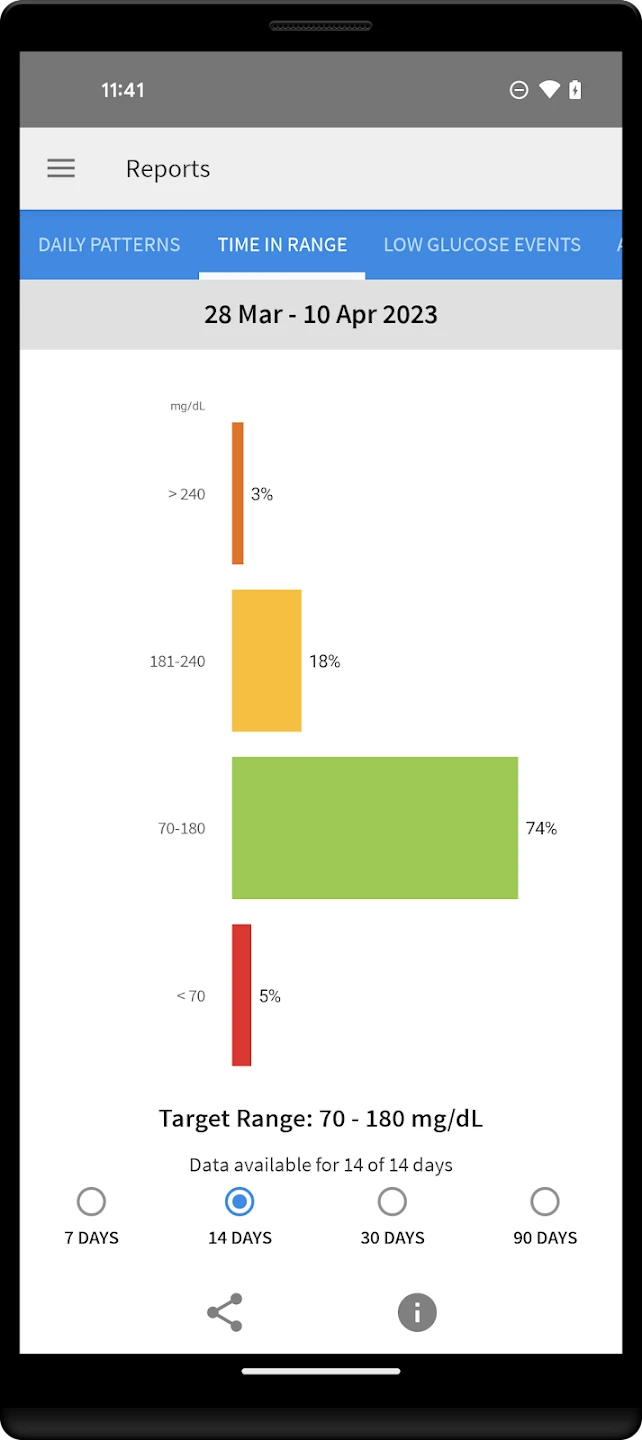 - Data Management & Export: Review up to 14 days of glucose history with filtering options and download reports for doctor consultations, providing detailed documentation for treatment adjustments.