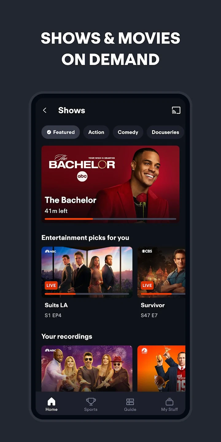 Leverages YouTube’s vast content library with access to major networks. Features include cloud DVR storage and customizable profiles. Ideal for users who value content discovery and sharing.