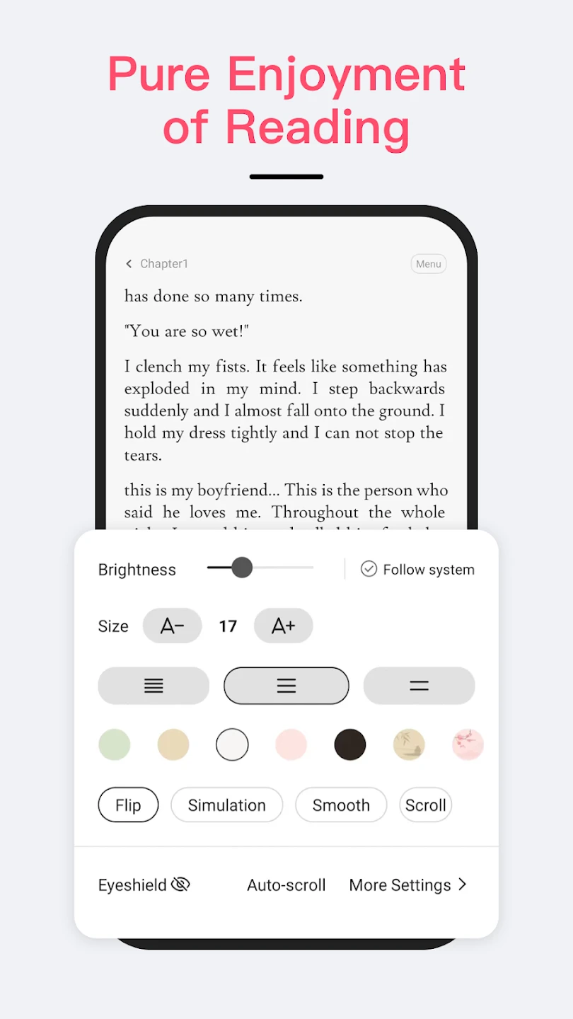 • Customizable Reading Interface: Adjust font size, text color, background themes, and night mode settings to suit personal preferences. This enhances readability during long sessions, reducing eye strain for users with specific visual needs or late-night reading habits.