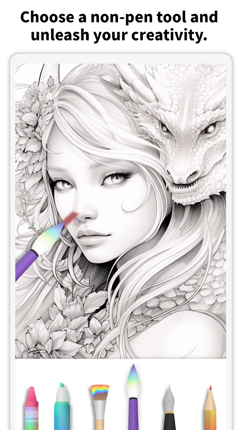 • Drawing Tools & Eraser: InColor provides a range of tools including pencils, brushes, markers, and an eraser, allowing users to create lines of varying thickness and opacity. This flexibility empowers users to mimic traditional drawing implements or create smooth digital strokes, enhancing both precision and artistic freedom.