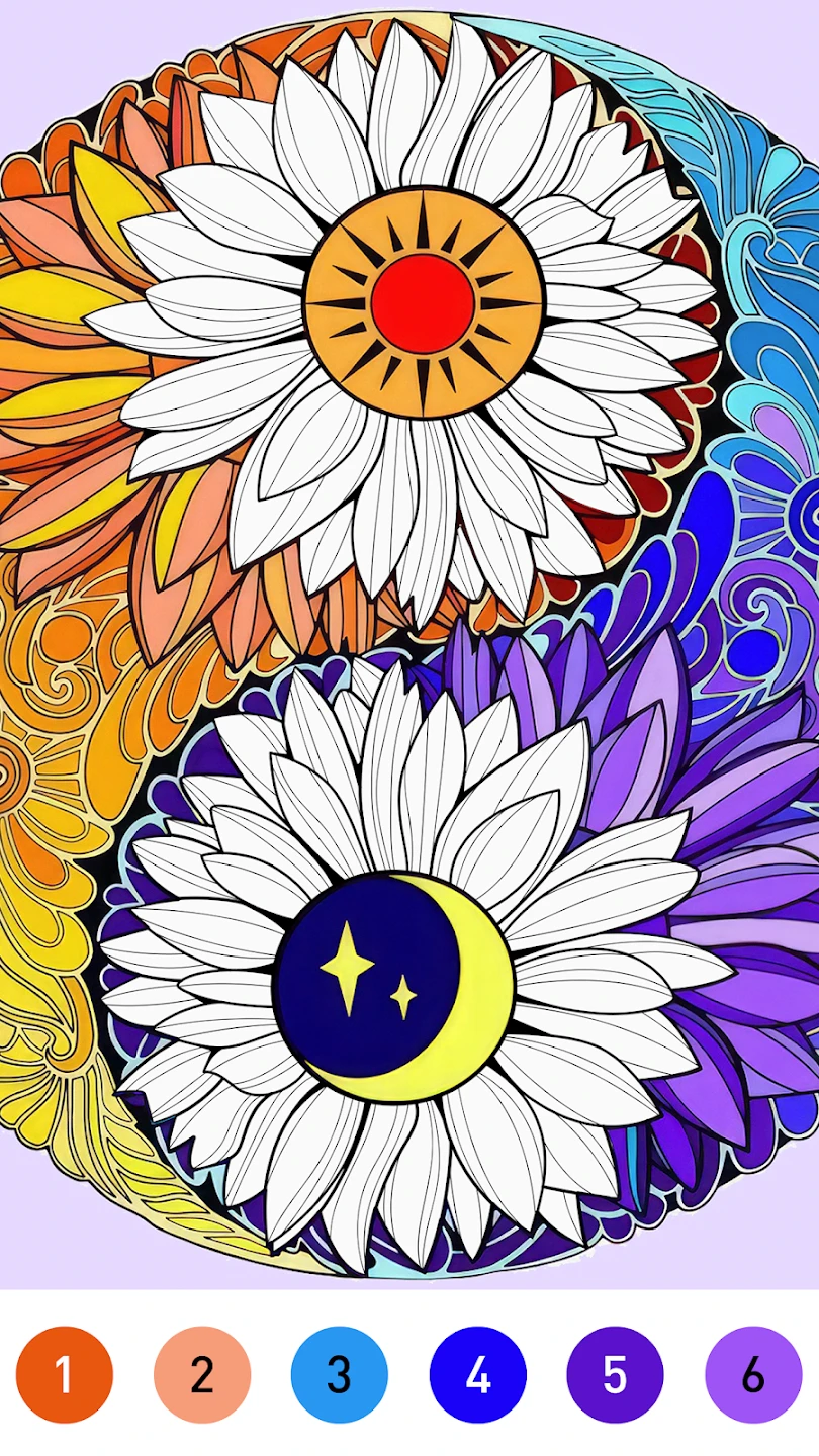 - Visuals or Art Style: The game features highly detailed, symmetrical mandalas with soothing color schemes. Each design boasts thousands of individual sections requiring coloring, presented in crisp, high-definition graphics that highlight intricate details and patterns.