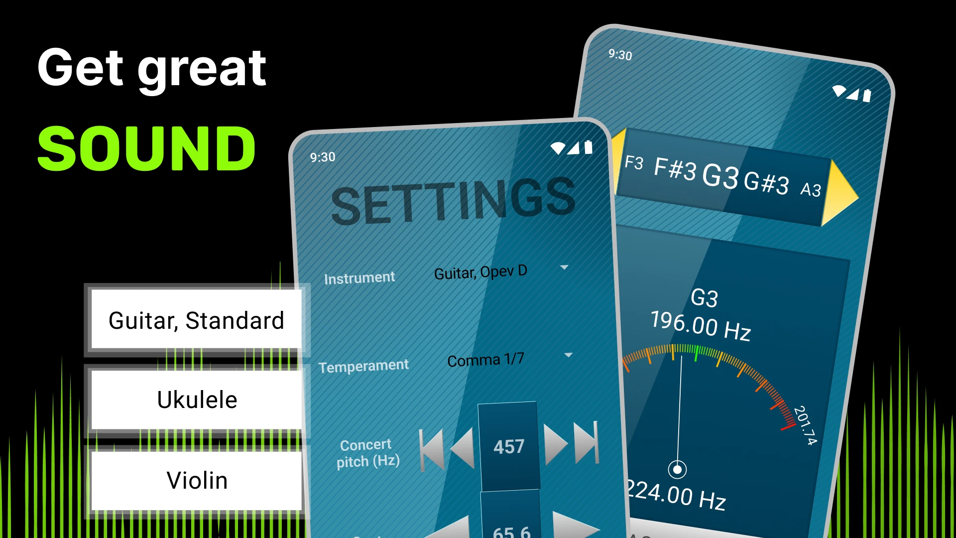 A: Our tuner natively supports 46+ tuning systems, from standard A4=440Hz to historical variations and custom inputs. You can even define completely original tunings based on specific musical modes or just frequency ratios.