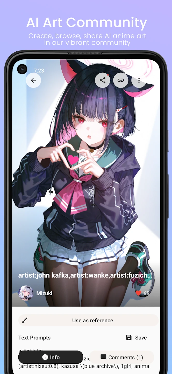 - Text-to-Image Generation: Enter a detailed description of the anime scene, character, or mood you envision, and PixAI: AI Anime Art Generator instantly creates a unique visual. This allows users to quickly visualize abstract ideas, generate character concepts from descriptions, or create background elements, significantly speeding up the creative process compared to traditional sketching.