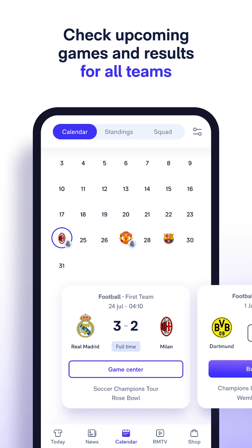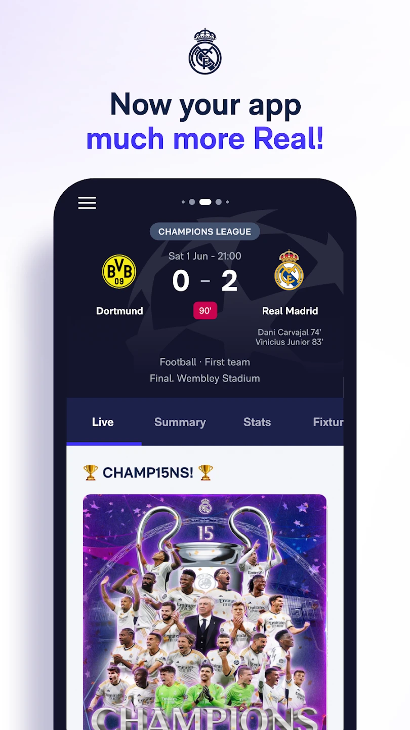 • Live Match Center: Get real-time match updates, official streaming options where available, and push notifications for crucial events during games. This keeps you informed instantly about Real Madrid’s performance on the field, helping you experience matches live even if you can’t attend them in person.