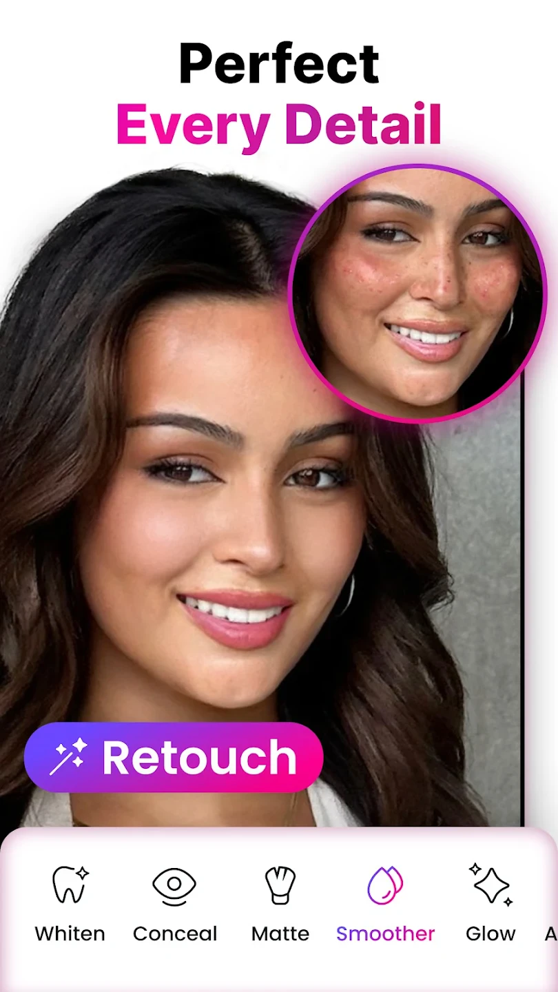 - AI-Powered Face Retouching: This feature automatically detects facial elements like skin, eyes, and hair, intelligently smoothing skin texture while preserving natural features and details. This allows for a flawless finish in seconds, perfect for quickly enhancing portrait photos for social sharing.