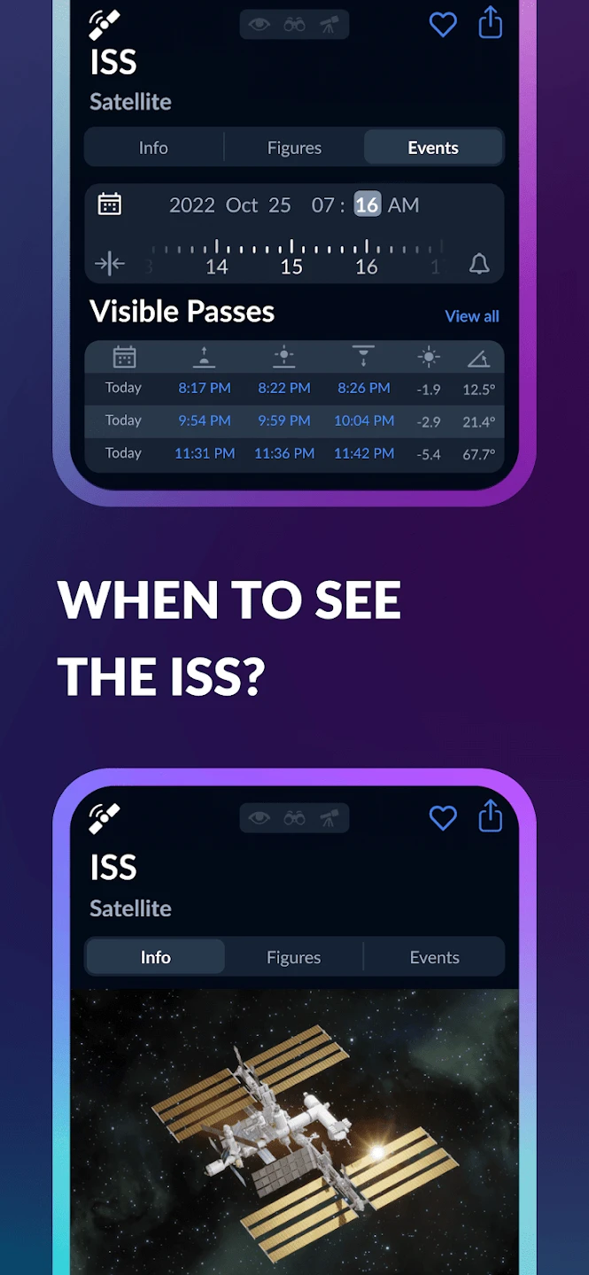 - Star & Planet Identification: Utilizing your device’s sensors and integrated telescope databases, this feature instantly identifies celestial bodies when viewed through the app. Specify the object size/threshold in settings for best results. It includes detailed information like magnitude, spectral type, distance, and associations. If you happen to spot an unfamiliar star cluster or a bright object late at night, activating this function instantly tells you its name, what it is, and points out interesting features.