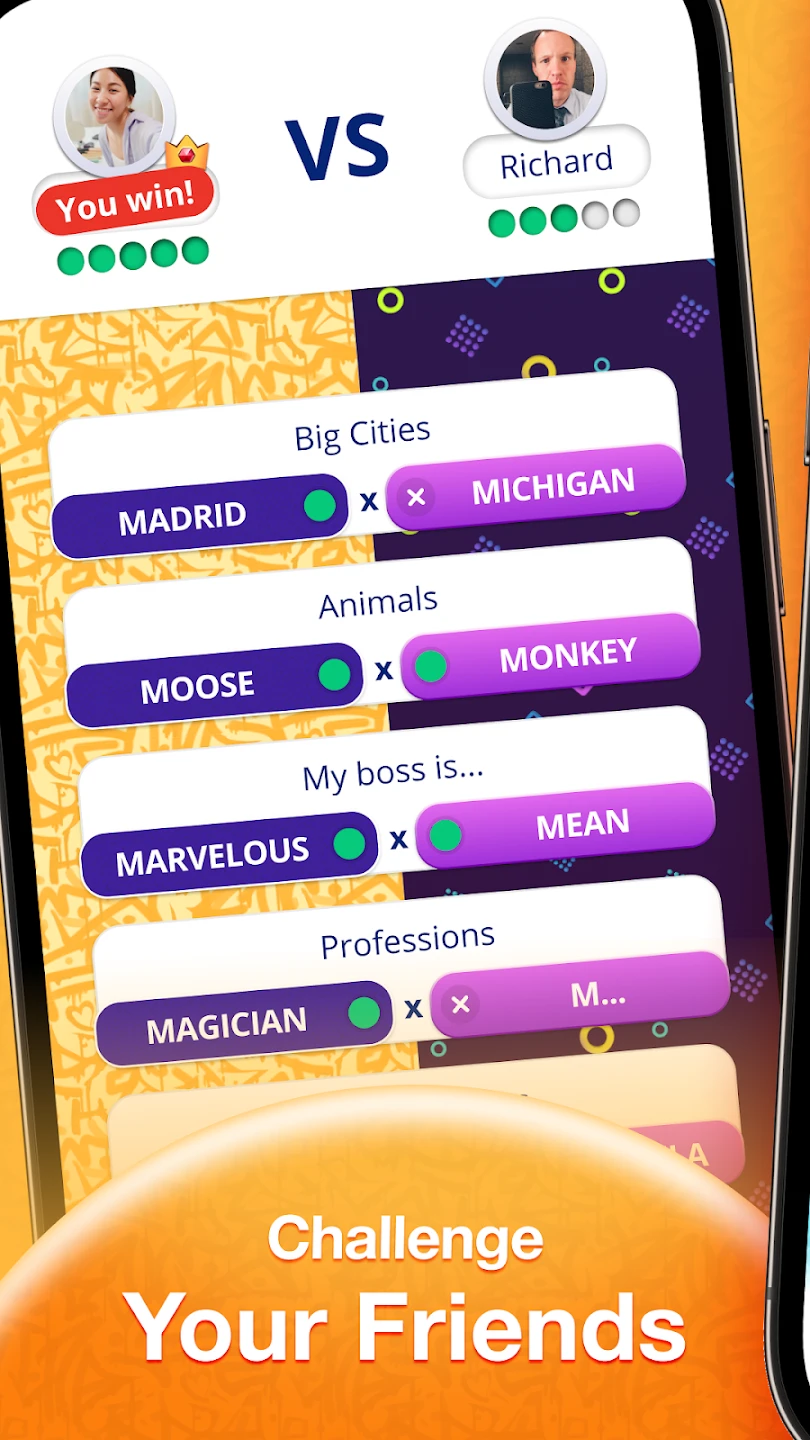 - Visuals or Art Style: The design employs a clean, minimalist interface with vibrant, pop art-style letter tiles featuring subtle gradients and shadows. Letter colors correspond to distinct point values, clearly communicating scoring potential. The background features subtle, abstract gradients or themed patterns that shift between game modes, complemented by satisfying particle effects during matches.