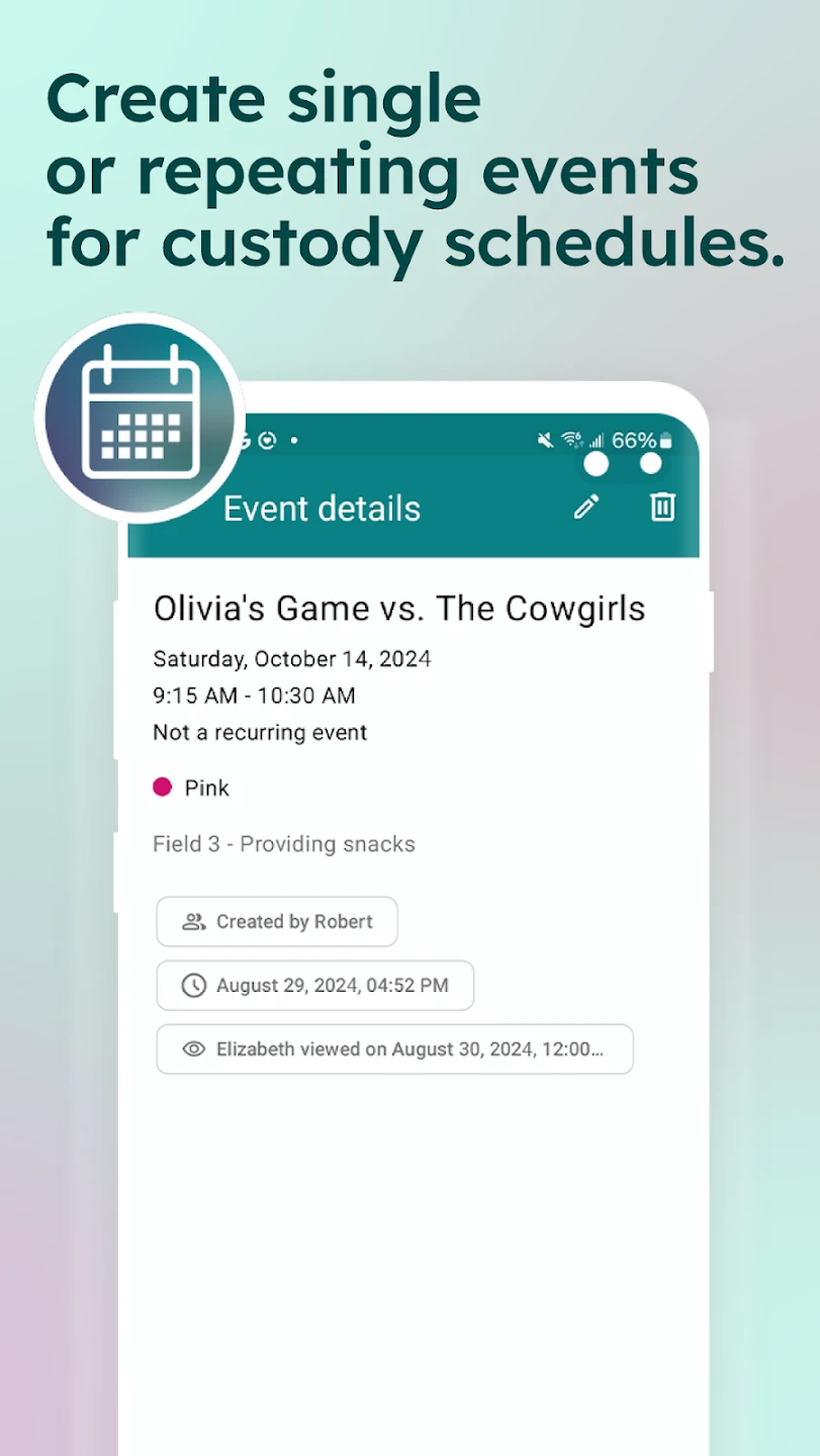 • Smart Calendar Synchronization: Automatically sync visitation schedules, school holidays, and events across both parent profiles. The system flags upcoming deadlines like custody changes or court dates, improving reliability and preventing missed appointments.