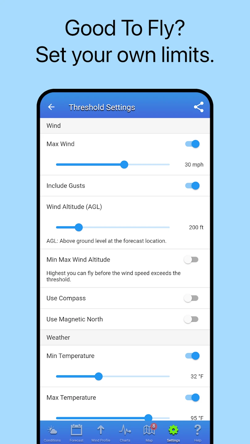 Directly targets drone pilots with tailored alerts and summaries, focusing heavily on wind speed limits and battery consumption forecasts specifically related to drone flight envelopes, making safety a central pillar. |