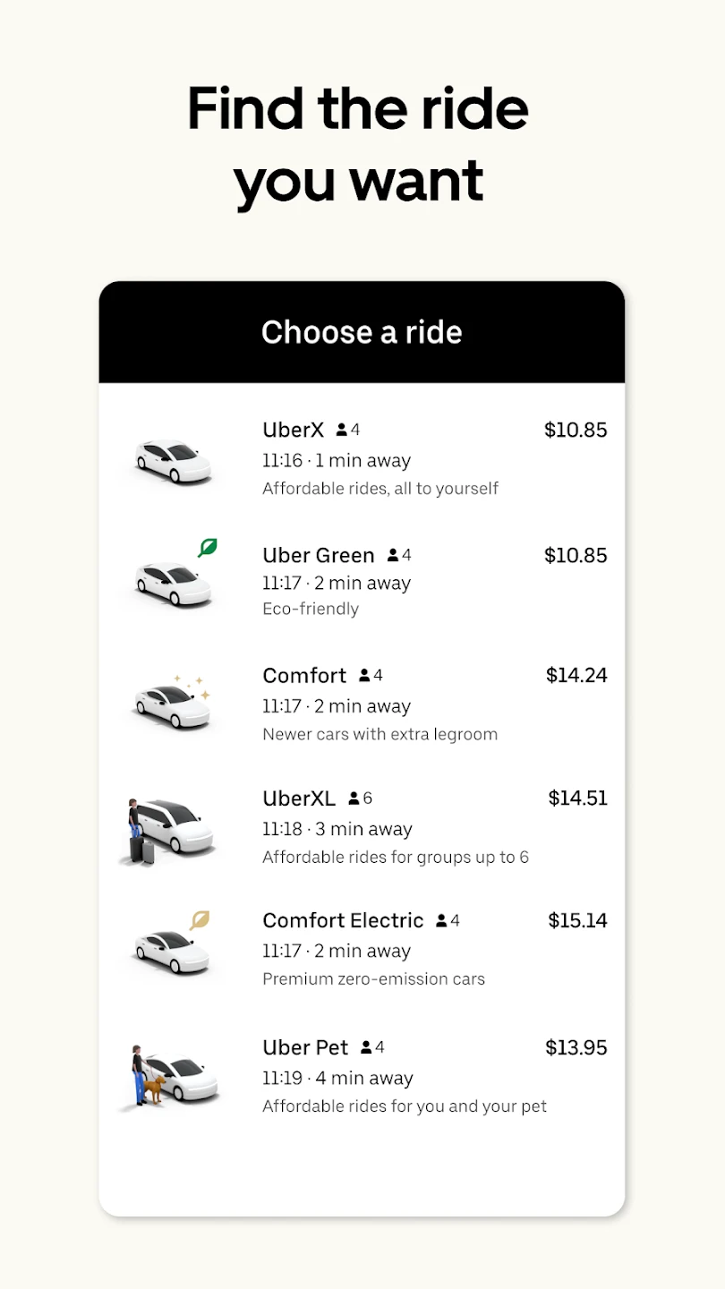 • Pre-Paid Fare & Secure Payment: Fare estimates are calculated automatically based on the route using real-time pricing. After requesting the ride, the fare is securely charged to a saved payment method, streamlining the payment process compared to paying with cash or a card at the end of the trip, thus reducing friction.