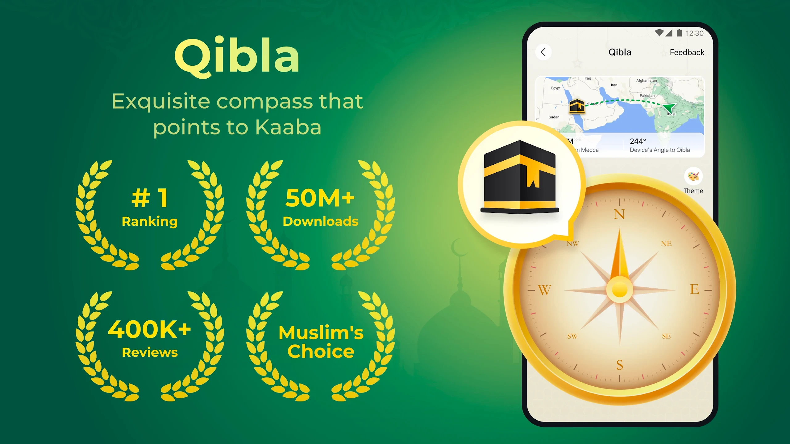 Specialized Qibla finder with beautiful Islamic artwork backgrounds and detailed geographical information for precise direction. |