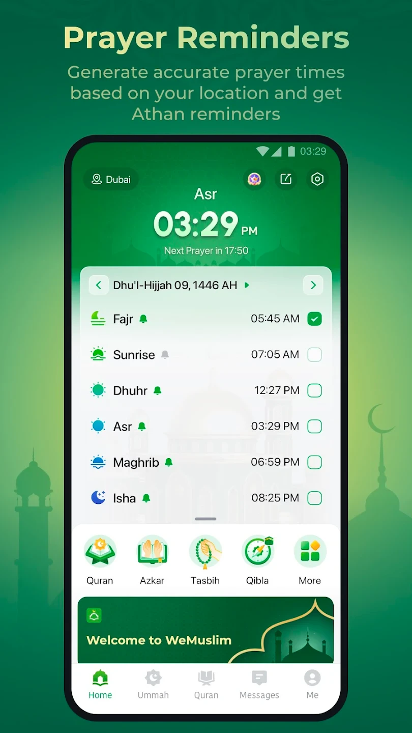 - Prayer Times & Adhan (Athan): Receives real-time prayer notifications based on your location and accurately plays the Islamic Adhan sound, guiding you through daily prayers at the right time. This feature helps maintain a consistent prayer schedule, ensuring you never miss your Fardh prayers even during busy workdays or travel.