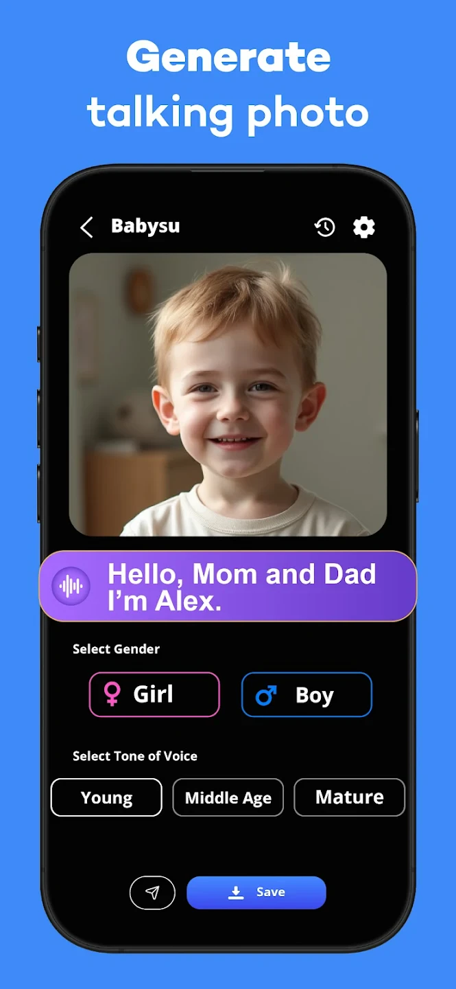 - Fun Animation Mode: Animate your baby avatars with subtle movements, enhancing the experience for users who want to see their digital creation “come alive” before sending it.