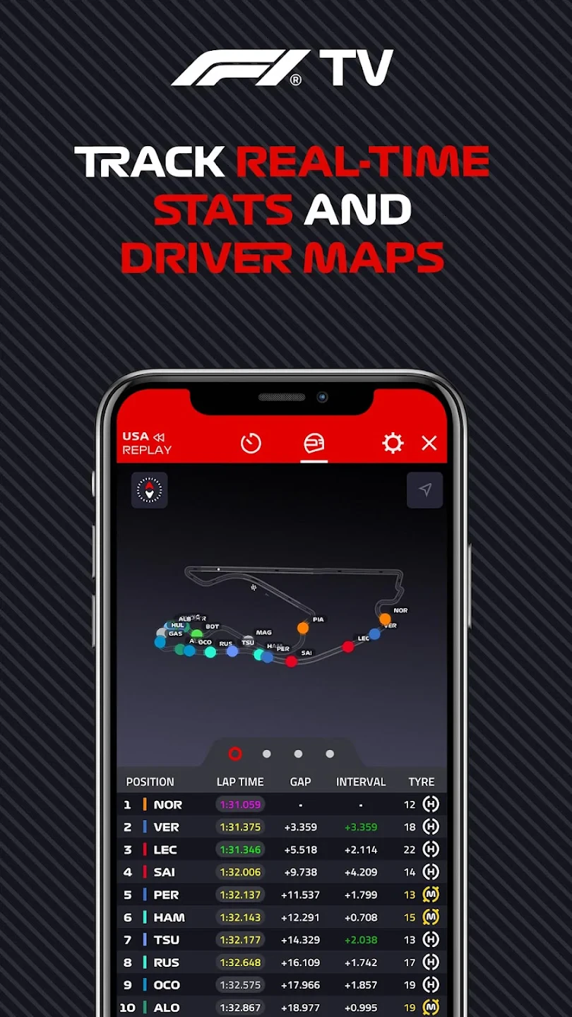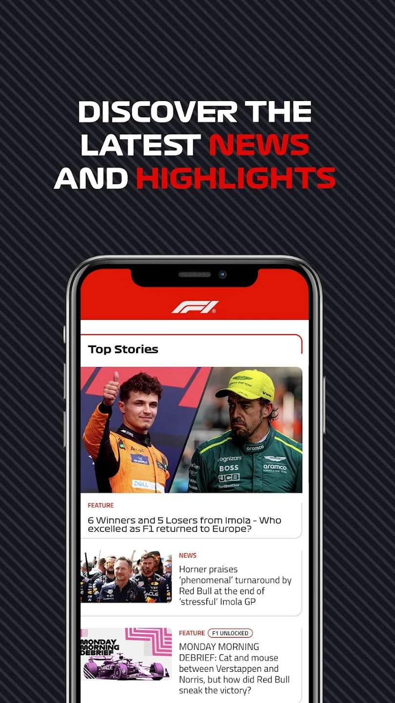- Live Action Stream: Leverage H.264/MPEG-4 technology for high-quality video streaming covering race highlights, selected race packages, and official driver interviews. This feature improves usability by delivering exciting Formula 1® content smoothly and reliably, even while navigating a busy track or commuting far from the race venue.