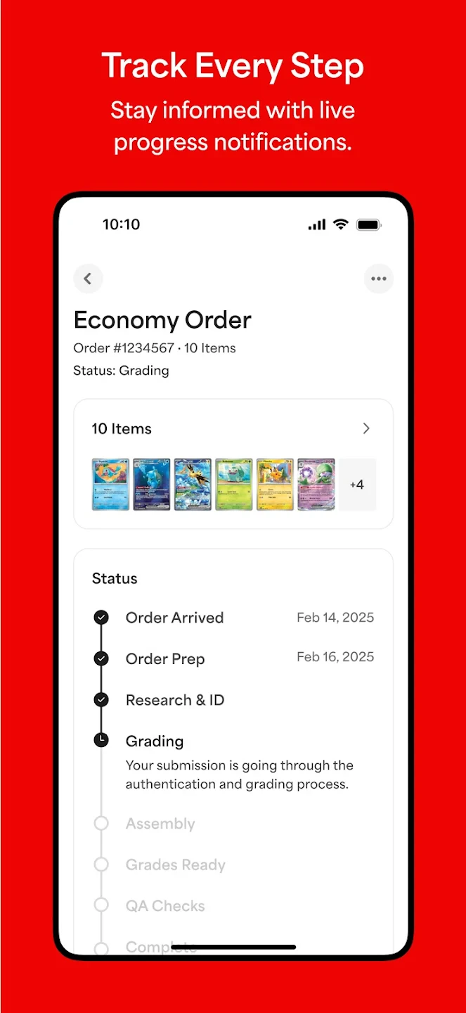 • Grading Status Dashboard: Access detailed tracking information through an intuitive interface showing current stage (e.g., received, photographed, graded), estimated timeline, and past grading history. The dashboard utilizes color-coding and milestone indicators to provide clear visibility into the process, enhancing transparency for users managing multiple submissions.
