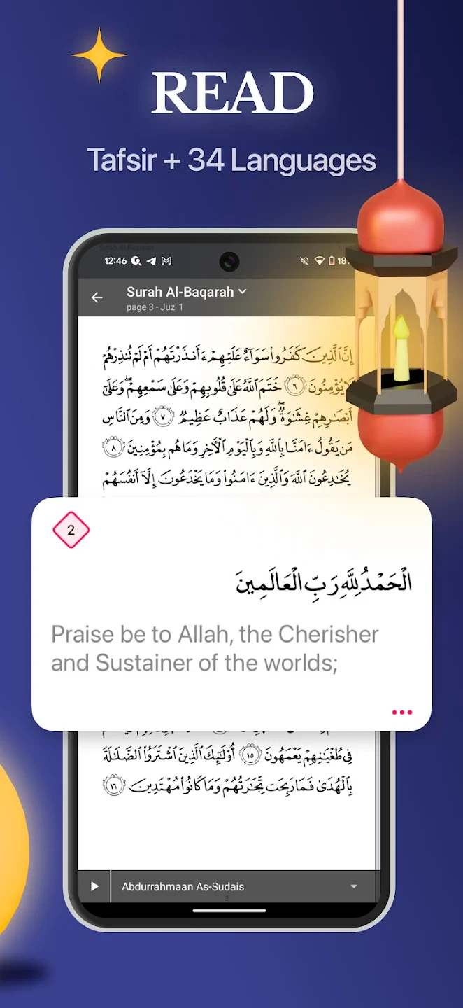 • Multiple Recitations by Renowned Scholars: Listen to the Holy Quran recited beautifully by famous voices from around the world like Mishary Rashid Alafasy or Abdul Rahman Al-Sudais. This function caters to diverse listening preferences and aids concentration, making reading easier and spiritually enriching for users with different cultural backgrounds.